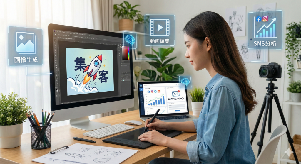ブログ記事やYouTube動画制作からSEO・SNS運用まで。AIを使ったコンテンツ戦略で集客を加速します。